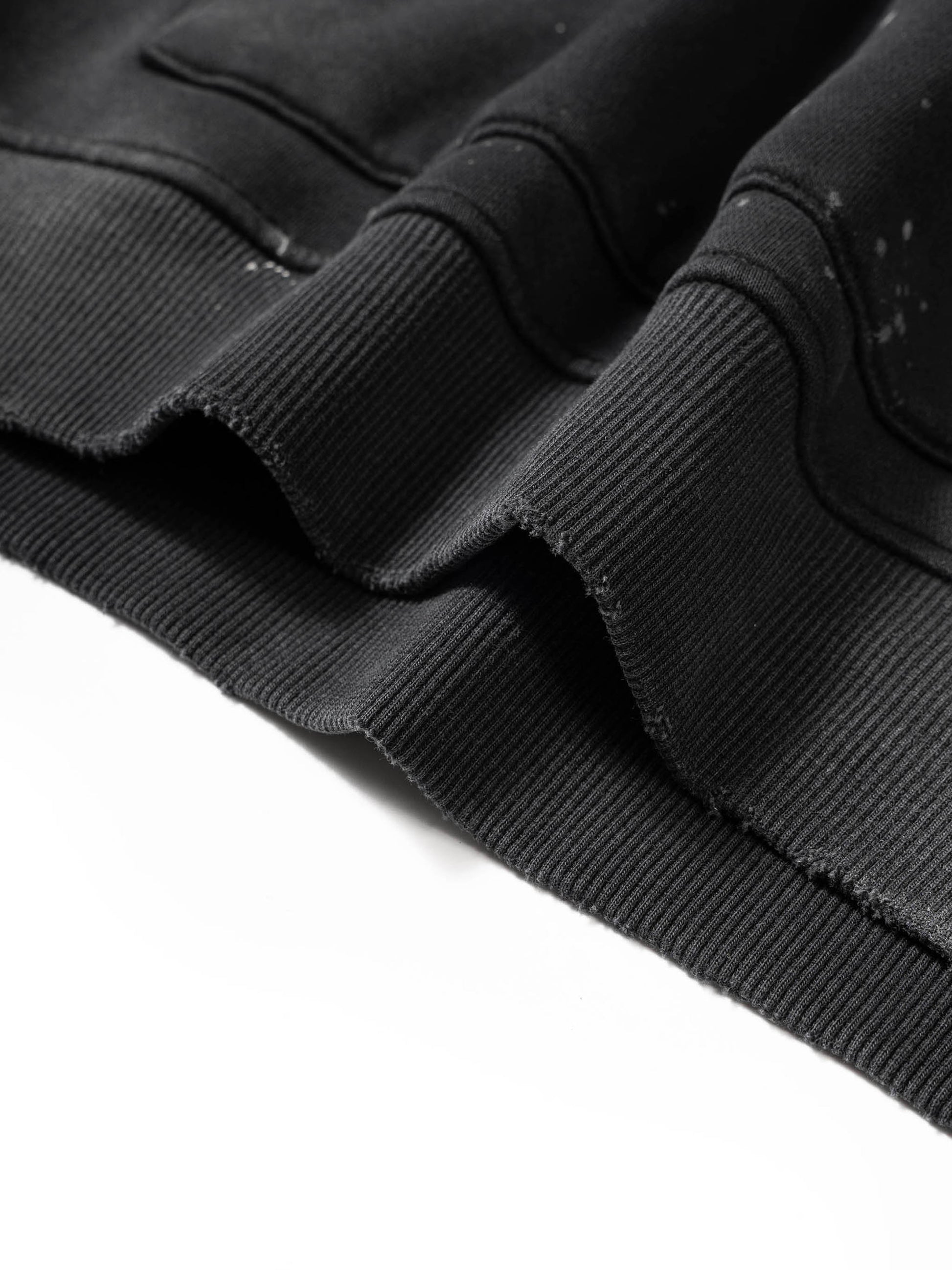 Crafted from a high-quality blend of 42% cotton, 53% polyester, and 5% other fibers, it provides a soft yet durable texture with slight stretch for everyday movement. The thick 10.6 oz/yd² (360 g/m²) fabric offers lasting warmth and structure, while the vintage-washed finish gives it a distinctive, worn-in character. Subtle frayed detailing around the edges adds a touch of individuality and urban edge.